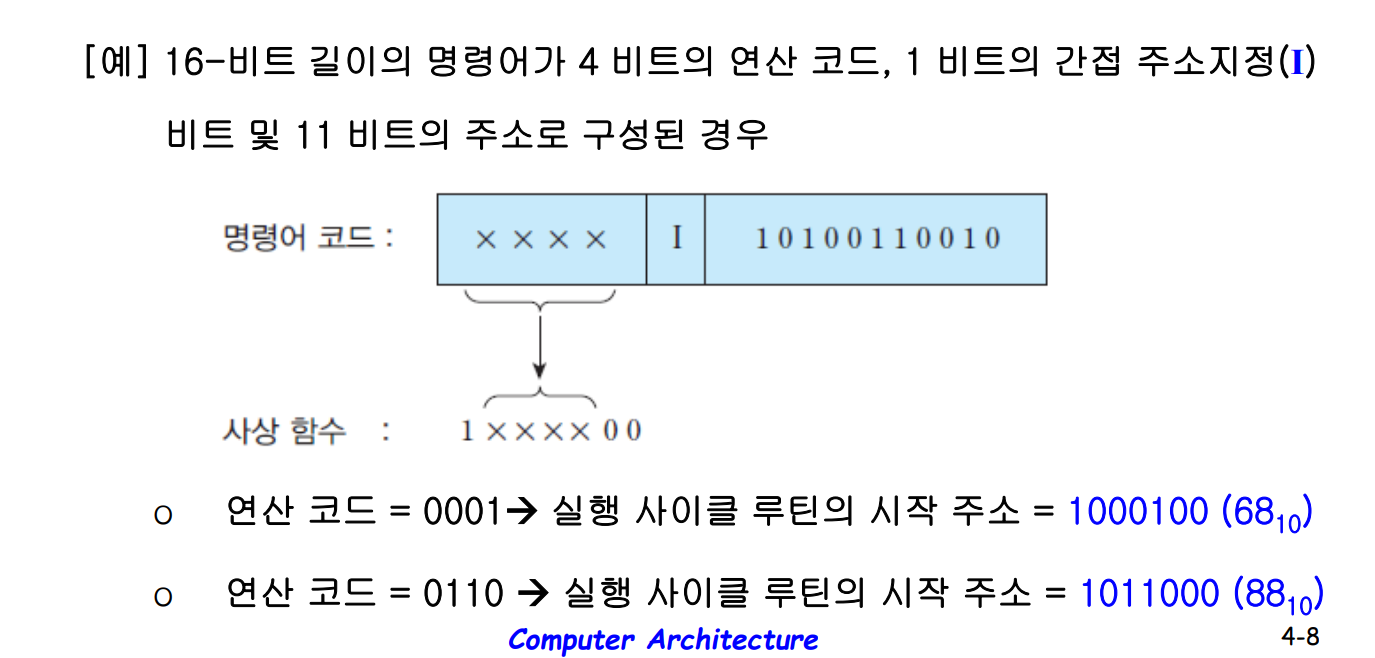 즉 명령어의 연산코드(명령어 코드)를 사상방식과 조합해서 시작 주소를 찾음.