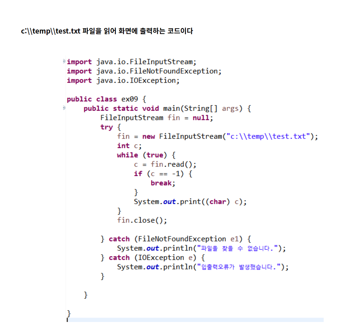 ▶파일을 찾을 수 없는 예외가 있기 때문에 입출력스트림을 쓸때에는 반드시 예외처리를 해줘야 한다.