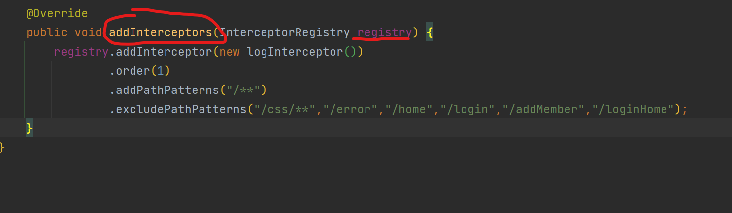 addInterceptors를 구현받으면 이렇게 생긴 메서드가 있을 것 이다. 여기에서 이제 인터셉트의 설정 정보를 적용 시켜야 한다. 기본적으로 인터셉트는 메서드 체이닝 형태로 사용 할 수 있는데