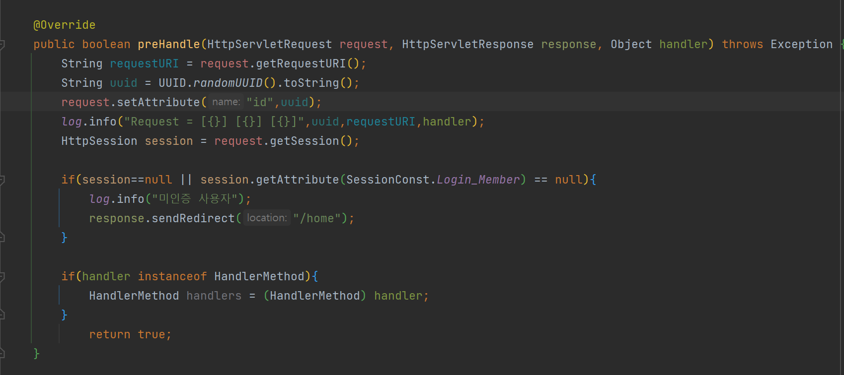 ▶ 리턴값이 Boolean임으로 리턴이 true일 경우 preHandle() 실행 후 핸들러에 접근한다.
