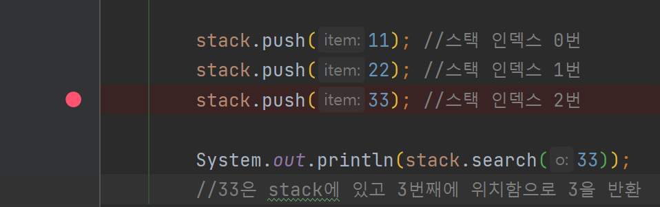 System.out.println(stack.search(1)); // 1번의 스택에 있는 값들을 가져옴 하지만 pop을 하는 순간